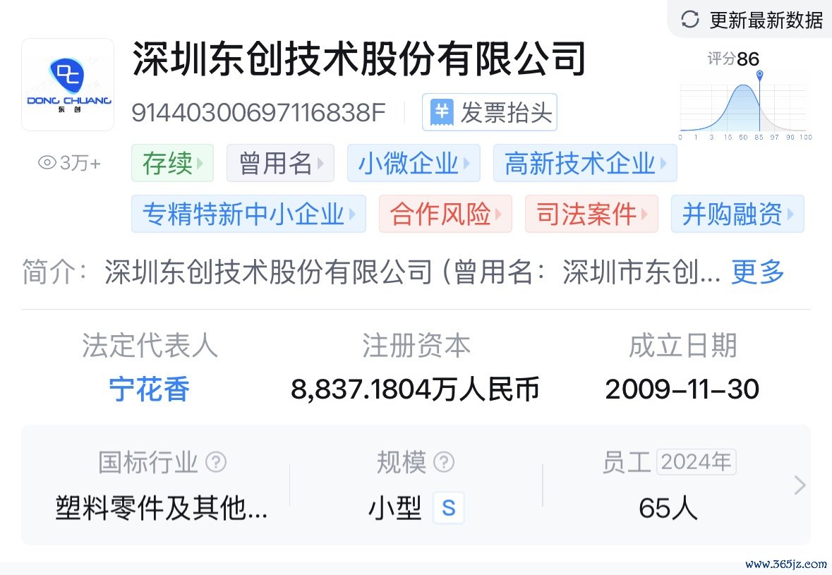 界面新闻记者查阅相关资料发现,深圳东创的主营业务为精密模具、塑胶功能件的研发制造。天眼查数据显示,截至2024年底,公司员工数65人,注册资本8837万元,在模具制造行业仅属于小型规模。