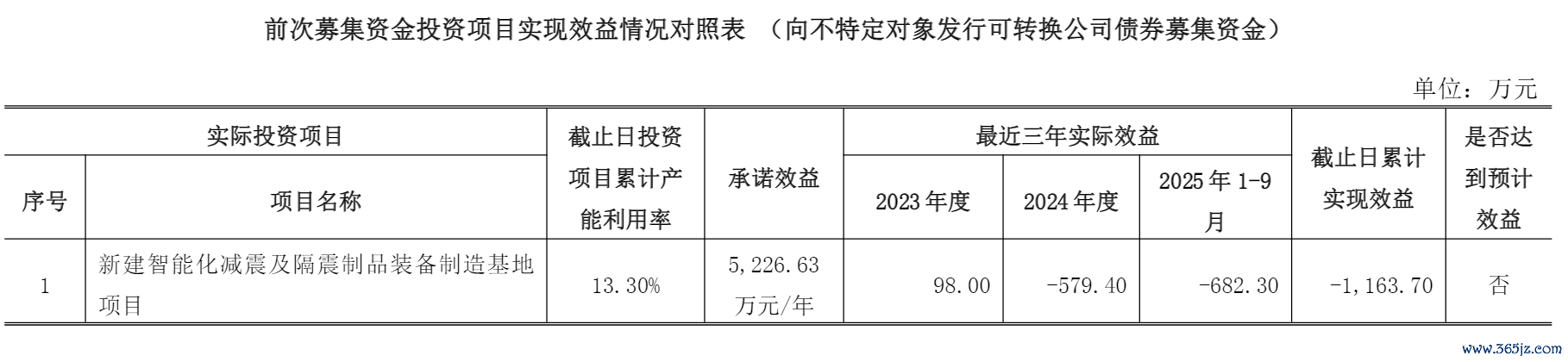 募投项目的"烂尾"更是让震安科技雪上加霜。2021年,公司通过可转债募资2.8亿元,计划投向"新建智能化减震及隔震制品装备制造基地项目",截至2025年9月,该河北生产基地的产能利用率仅为13.3%,累计亏损1163万元,成为拖累业绩的重要因素。更令人诟病的是2022年定增的2.5亿元资金中,7000万元计划用于研发中心建设,却因土地招拍挂程序未履行完毕至今未实际投入。